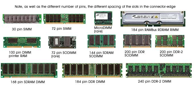 Los tipos de módulos más habituales en la actualidad son los módulos DDR, DDR2 y ya bastante menos los módulos SDRAM (aunque hay que aclarar que todos estos tipos son SDRAM, es decir, Synchronous Dynamic Random Access Memory, lo que se conoce normalmente por memorias SDRAM son las memorias SDR(Single Data Rate), en contraposición a las DDR (Double Data Rate). Estos módulos se han ido sustituyendo en el tiempo. Primero fueron los SDRAM, que dieron paso a los DDR y estos a los DDR2.